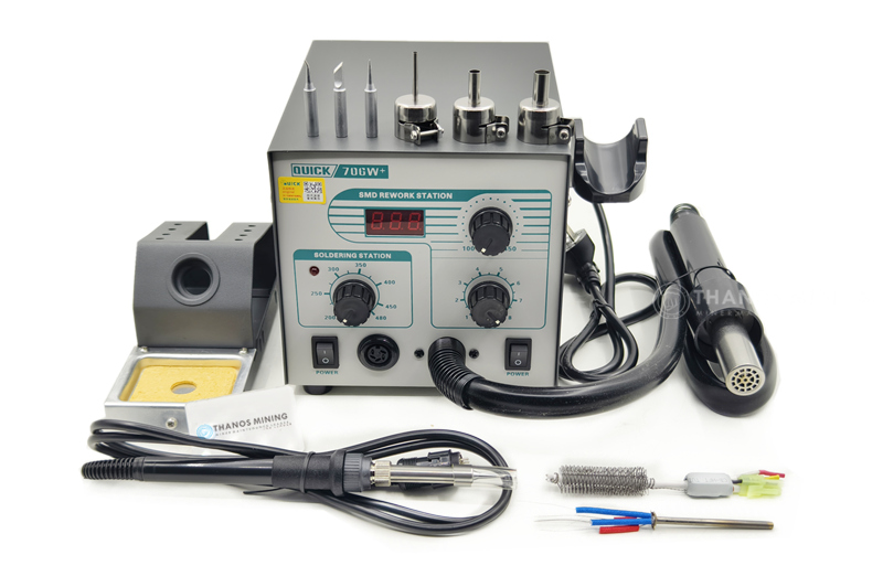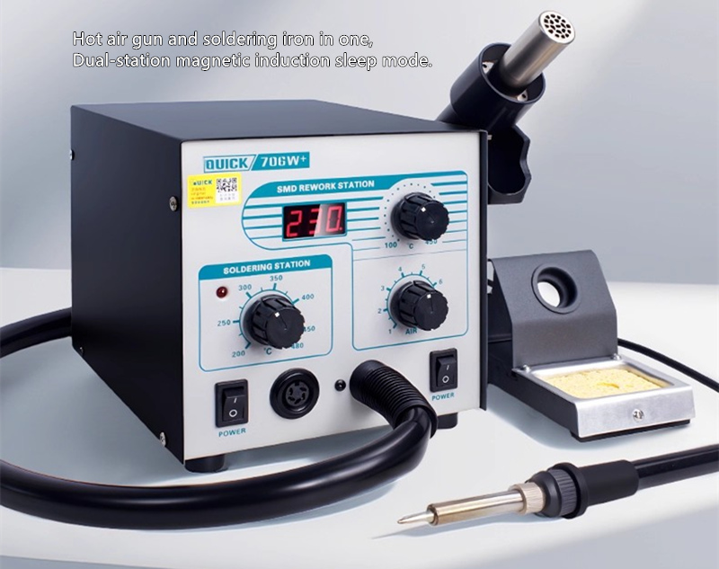 The Quick 706W+ is a smart desoldering station that integrates a hot air gun and a soldering iron.